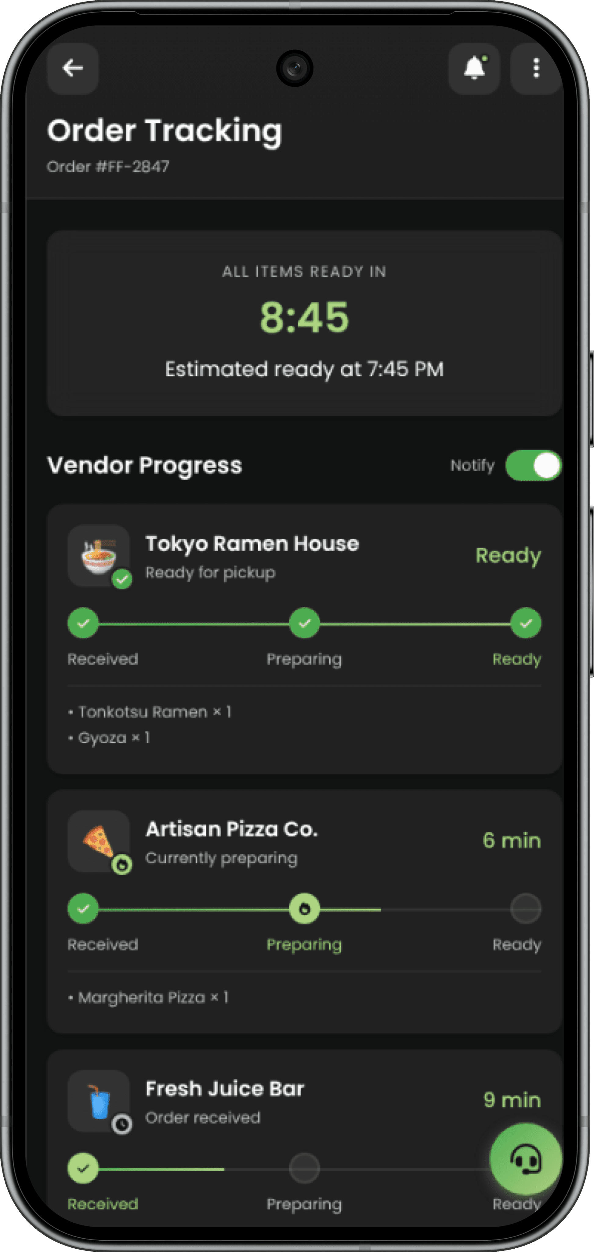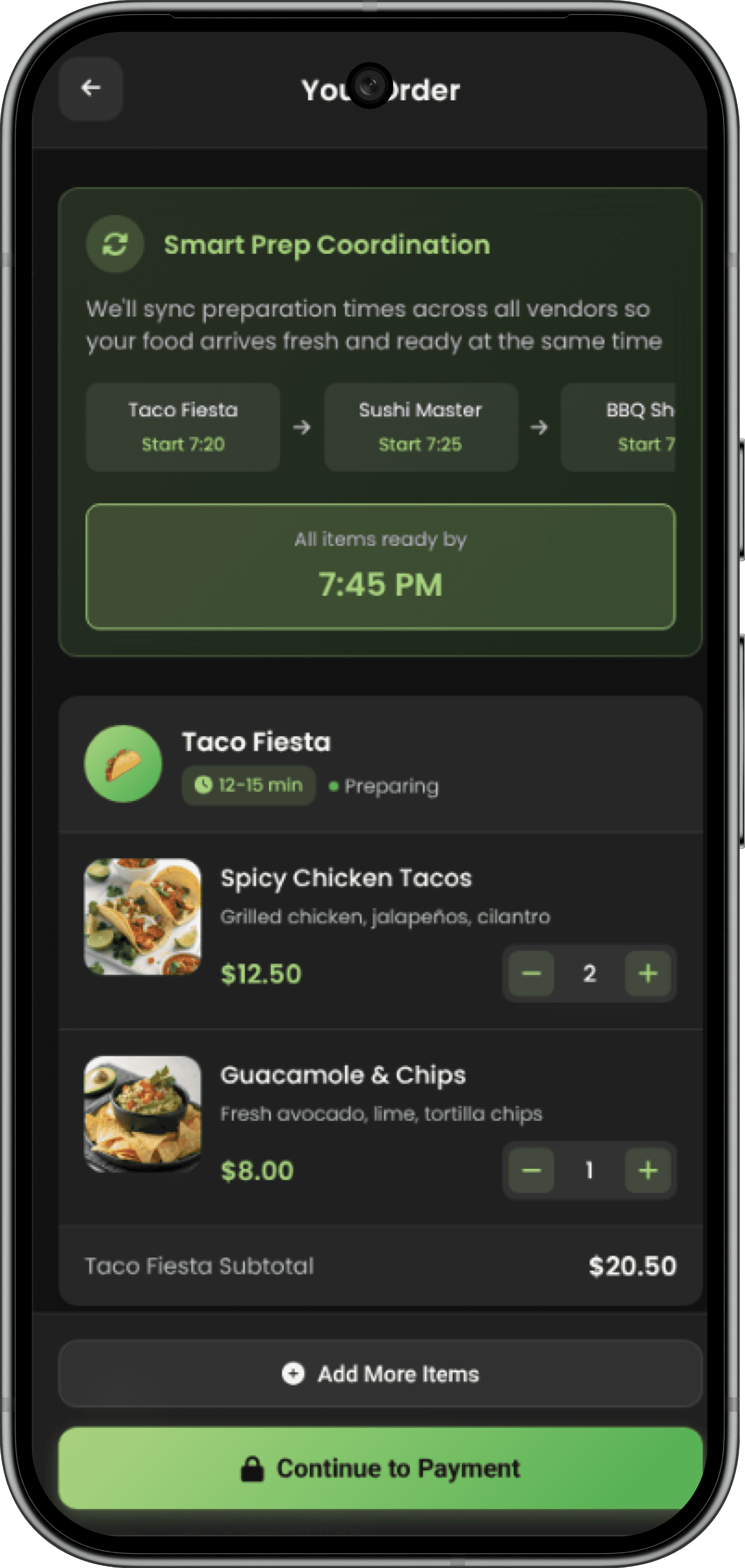 Mobile App for Refuel a party vendor & user food ordering experience featuring a smart feature that coordinates order and deliveries from different vendors.