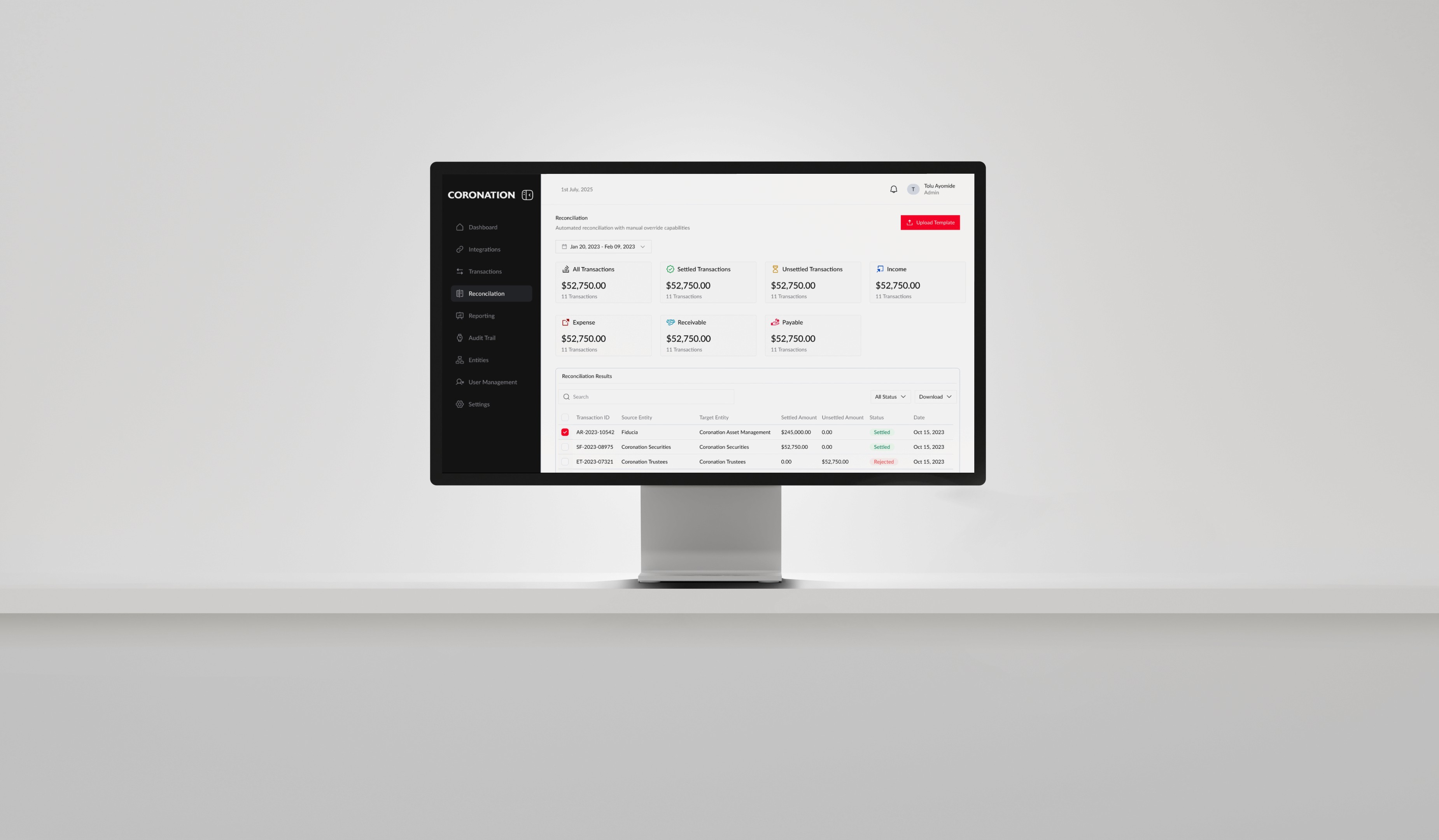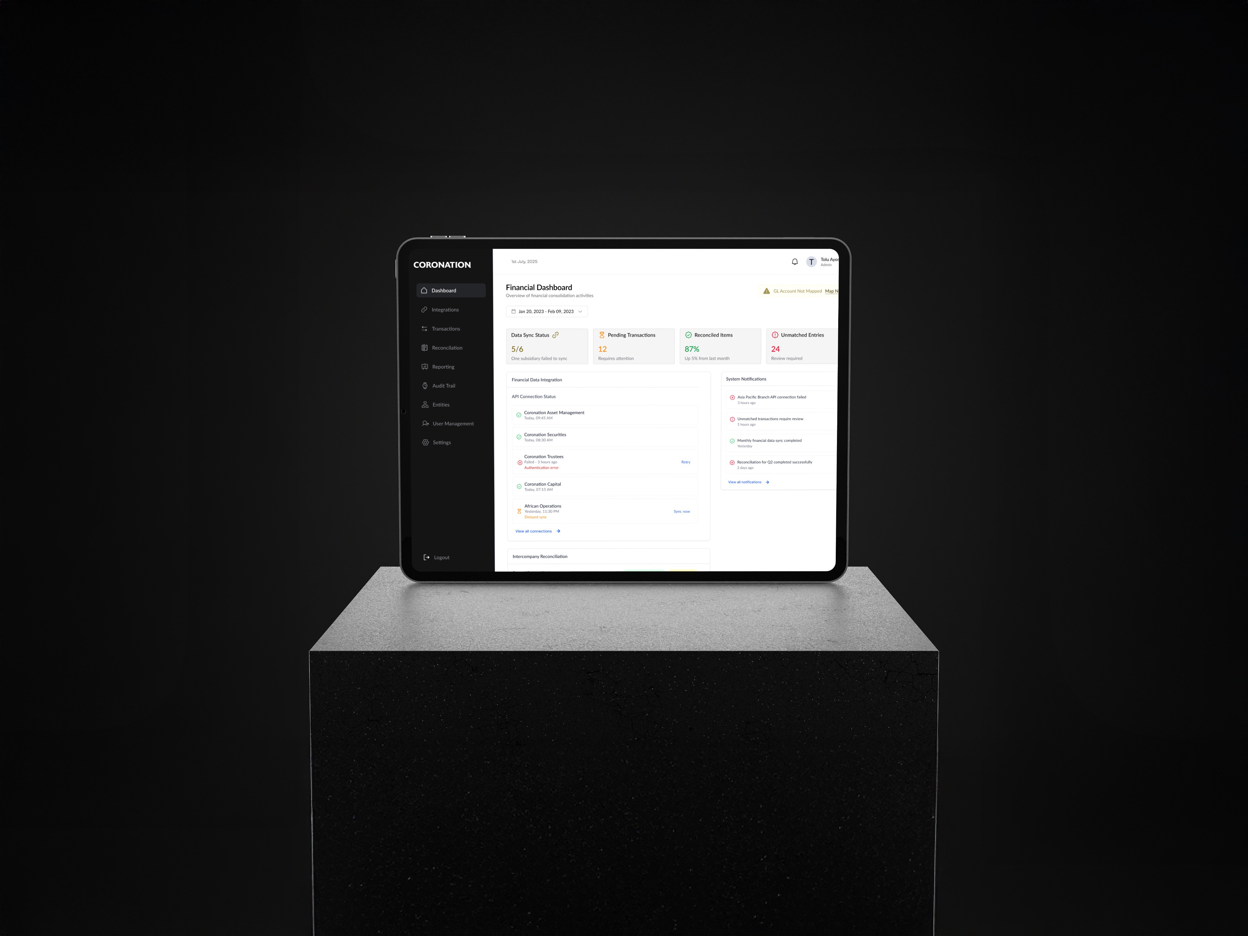 Web App for Coronation designed to help finance and operations teams monitor, reconcile, and report financial positions across multiple entities, branches, and account levels.